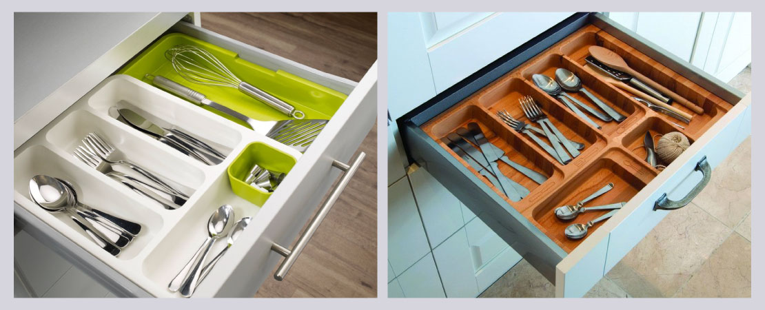 You got your hands laid upon almost everything when all you just wanted was the star nozzle for dressing up the cake you just baked – sounds familiar? Cutlery and small pieces like nozzles etc are so easy to lose as you pull open or push the kitchen drawer shut. No matter how many times you put all the same sized spoons and forks together neatly, they get all mixed up. So, what’s the solution? Installing expandable cutlery trays1. You can expand them according to the size of your drawer and not even an inch of the inside is wasted. Now you are all ok to have your sundry items, forks and spoons organised.
