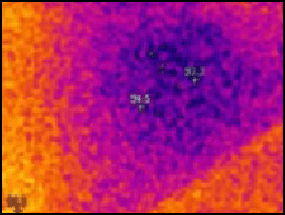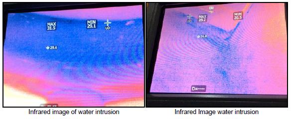 - IR images showed presence of moisture at external wall above reception area entrance door and around DB panel. The wall surfaces are affected by moisture infiltrating from #1- Roof- Parapet wall, #2- External facade – Plumbing duct, #3- Cracks at wall surface.