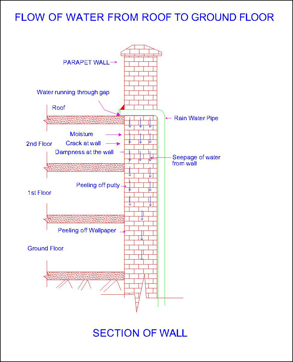 In this case we got to know that intrusion of external moisture was mainly from plumbing duct and above roof rain water outlet with cracks at external wall surface.