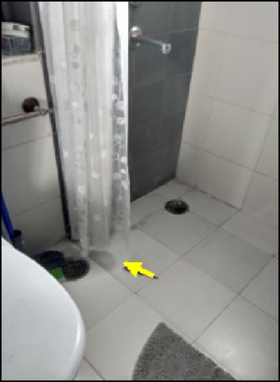 Water seepage from bathroom floor to door-frame and adjacent wall.